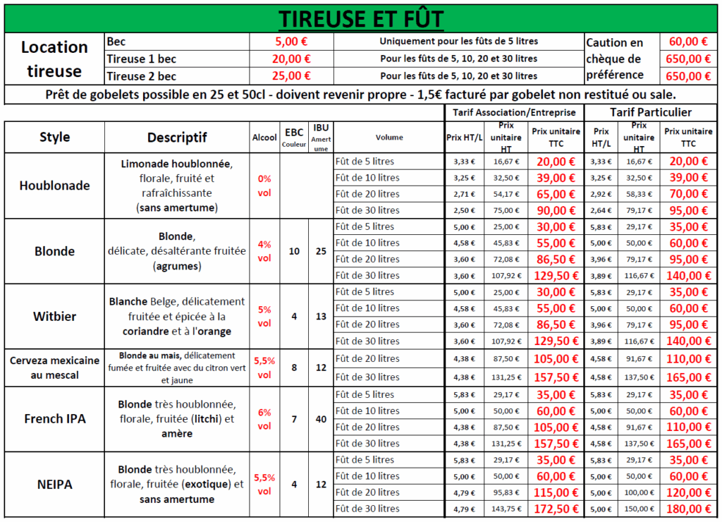 Nous proposons une gamme de bière et de soft en fût disponible tout l’année (tableau ci-dessous) ainsi que la location de tireuses et becs pompe à bière.