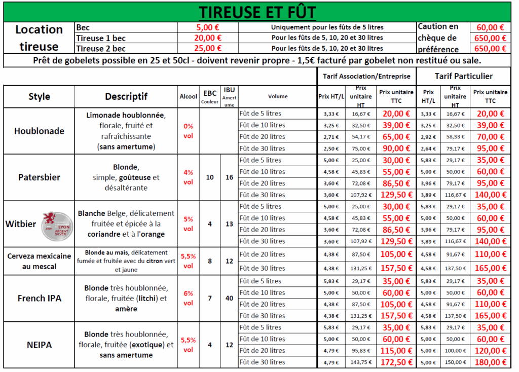 Une caution de 650€ par tireuse et 60€ par becs pompe à bière sera nécessaire au moment du départ, possible par chèque (de préférence) ou CB (empreinte bancaire).